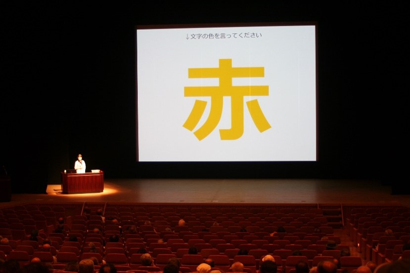休憩を挟んで、県健康づくり協会から「合言葉は『最近フレッてない?』~笑顔いっぱいの豊かな人生のために~」と題して講演が行われました。高齢者が十分注意すべき「フレイル」について、その症状、原因、予防法について、参加者にとっても分かりやすいお話がありました。特に、日常生活で取り組みやすい具体的な予防法等について、必要な栄養を取るための食事内容やトレーニング方法(ロコトレ)が示され、参加者自身の体調、体力に応じた取り組みのお話がありました。説明の中で、「開眼片脚立ち」や「スクワット」などの実技指導もあり、参加された皆さんは現在の体調の把握になるとともに、継続的な適切な運動の必要性を認識する良い機会となったようです。